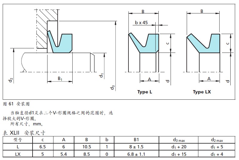 VL形水封的尺寸經常可以從一組直徑范圍內選取,如軸的公稱直徑是處于兩組推薦值的邊界范圍外,則應選用下一組較大的VL形水封。