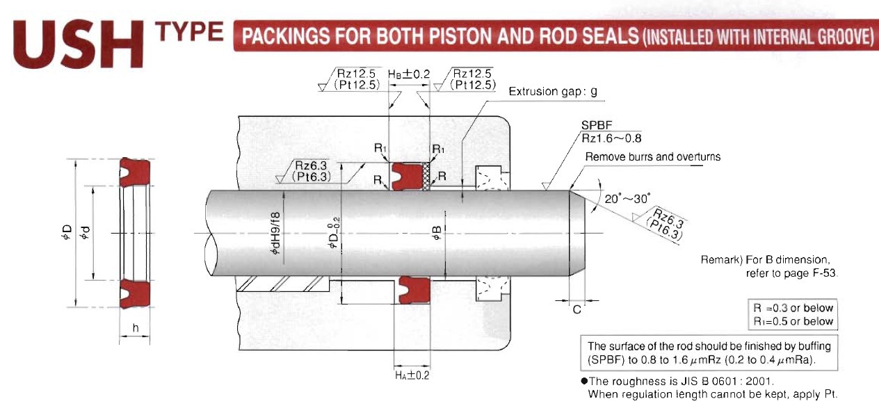 USH型孔軸兩用密封材料包括邵爾82度低溫丁氰橡膠NBR,邵爾90度丁氰橡膠NBR和邵爾90度氟橡膠FKM兩種,壓力可達(dá)到21MPA,邵爾82度低溫丁氰橡膠材料適用溫度:-55度---+80度,邵爾90度丁氰橡膠材料適用溫度:-25度---+100度,氟橡膠材料適用于溫度:-10度---+150度, USH型孔軸兩用密封具有較小的截面,可裝入整體溝槽中。