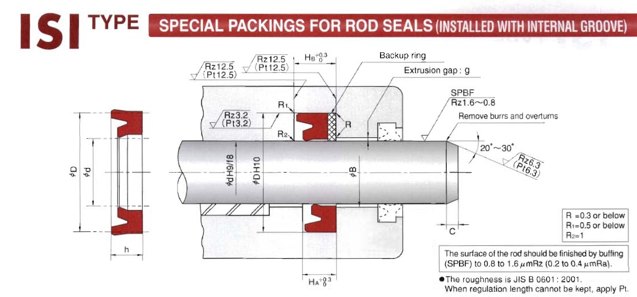 ISI型軸用密封主要材料是邵爾94度聚氨酯,壓力可達(dá)到42MPA,溫度:-35度---+100度,有極好的耐磨性和密封能力。他有較小的截面,可裝入整體溝槽中。