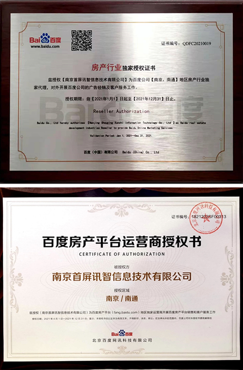會上,百度公司正式授權(quán)南京首屏訊智信息技術(shù)有限公司為南京、南通地區(qū)房產(chǎn)行業(yè)獨家代理商及百度房產(chǎn)平臺南京、南通地區(qū)獨家運(yùn)營商,并頒發(fā)授權(quán)證書。首屏訊智自2004年成為百度合作伙伴,始終致力于為廣大企業(yè)提供優(yōu)質(zhì)的互聯(lián)網(wǎng)營銷服務(wù)。擁有17年豐富互聯(lián)網(wǎng)行業(yè)服務(wù)經(jīng)驗的首屏訊智,已服務(wù)南京企業(yè)2萬余家,助力廣大企業(yè)快速穩(wěn)健發(fā)展。